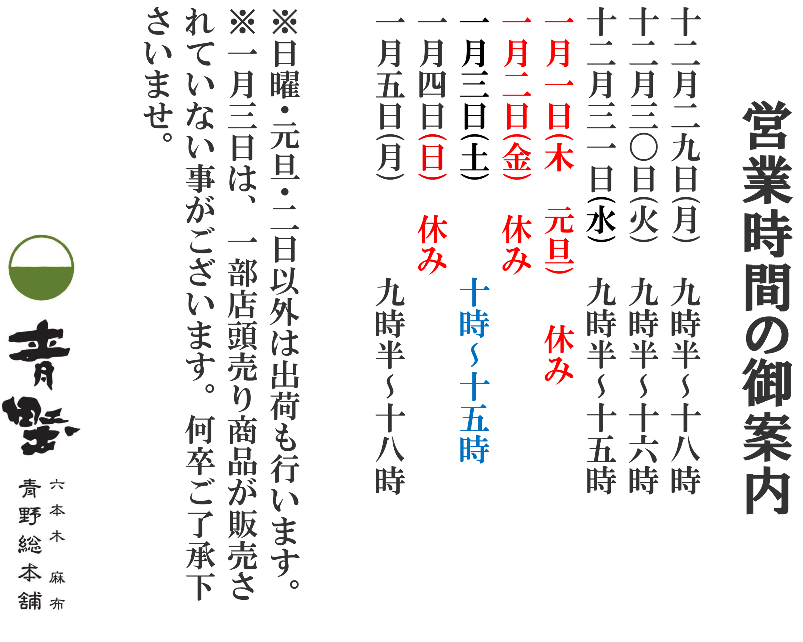 和菓子 東京 六本木 麻布 青野総本舗 〒 106-0032 東京都 港区六本木3-15-21 TEL: 03-3404-0020 FAX: 03-3404-0076 E-mail: info@azabu-aono.com =営業時間= 平日 : 9:30~18:00 土曜・祝日 : 9:30~18:00 定休日 : 日曜・1/1・1/2